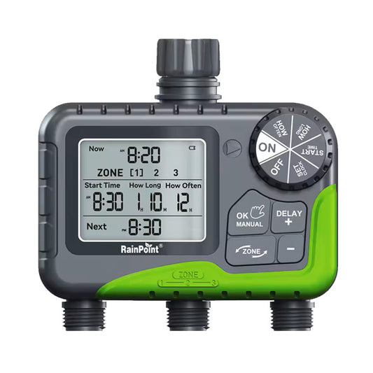 Con los temporizadores de Riego Automático RainPoint, podrás regar una, dos o hasta 4 sectores diferentes de tu jardín sin esfuerzo, ahorrando agua, tiempo y dinero.